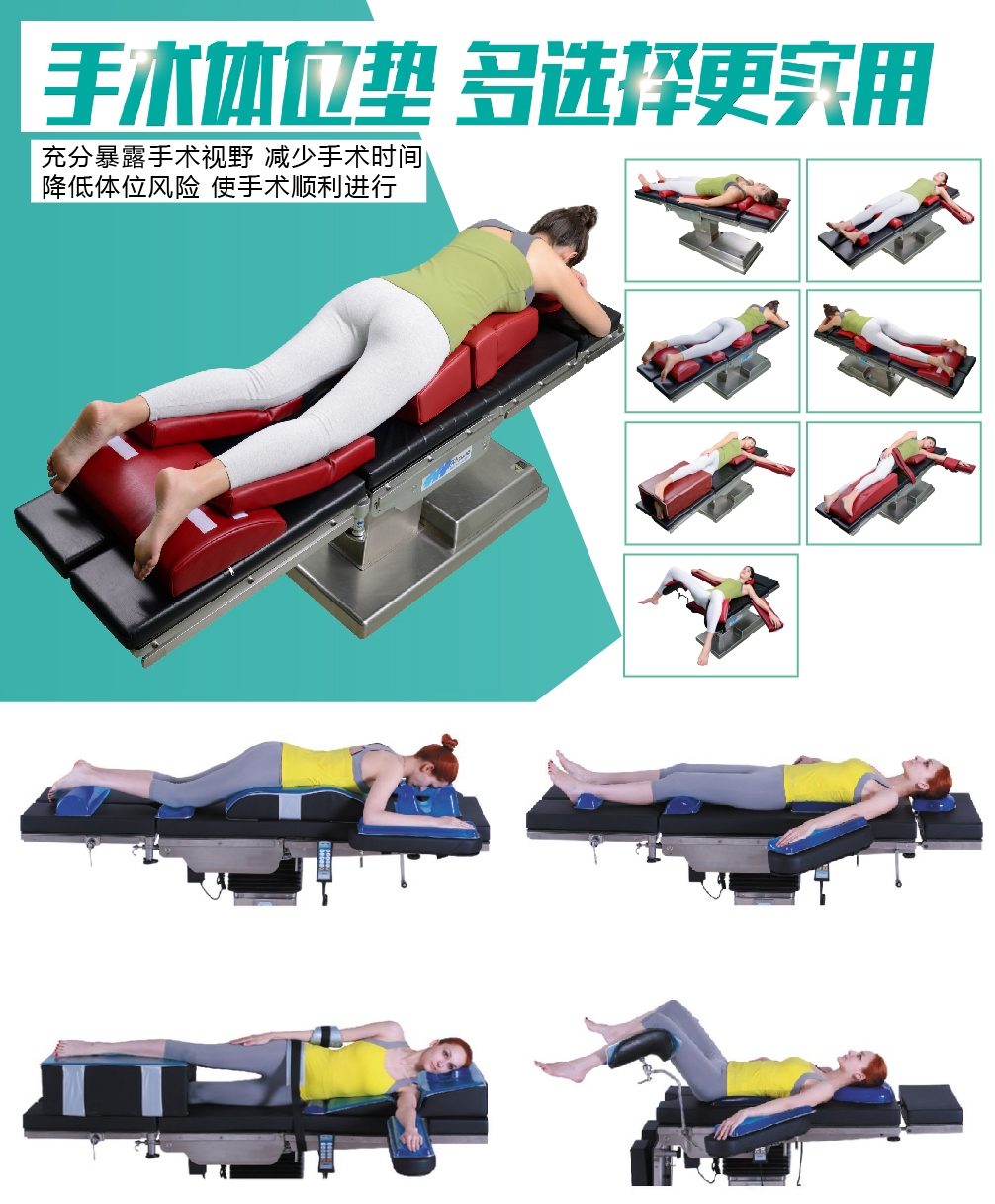 俯臥位手術包含胸墊、髂嵴墊、腿墊等組件,貼合胸腹部、髂腰部及下肢生理曲線,保障手術過程中呼吸通暢與體位穩定;側臥位搭配隧道墊,滿足胸廓、骨科手術的軀體固定與減壓需求,減少術中體位偏移;甲狀腺手術用頸部支撐墊,貼合頸部生理弧度,既能穩定體位,又能充分暴露手術視野,為手術開展提供助力。